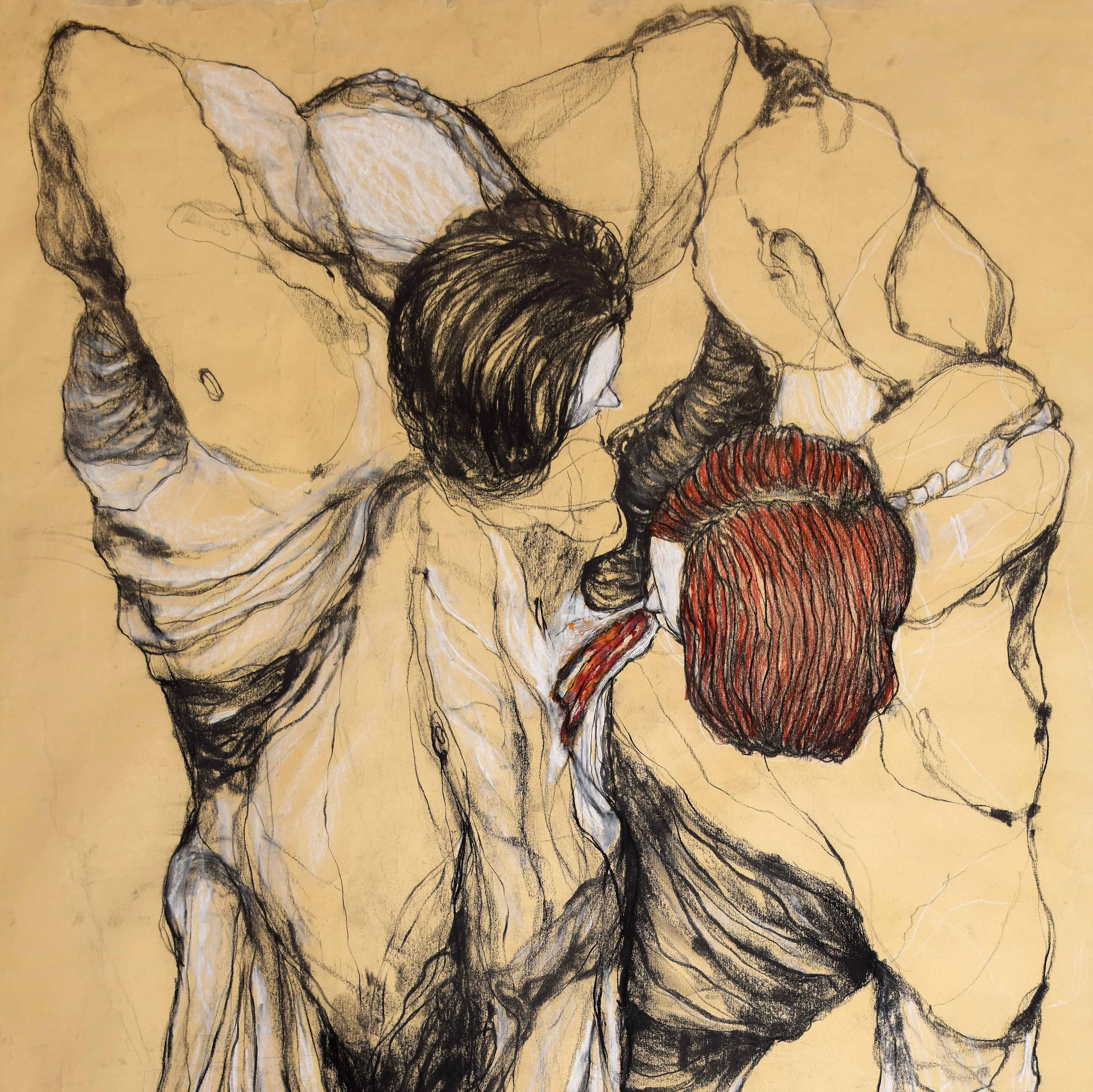 "I put my face close to yours and I still don't know if I'm goingo to eat you or to kiss you" (Italo Svevo), Charcoal, pastel and oil on (torn) paper, 2,50 m x 1,50 m. This is a crucial work.
