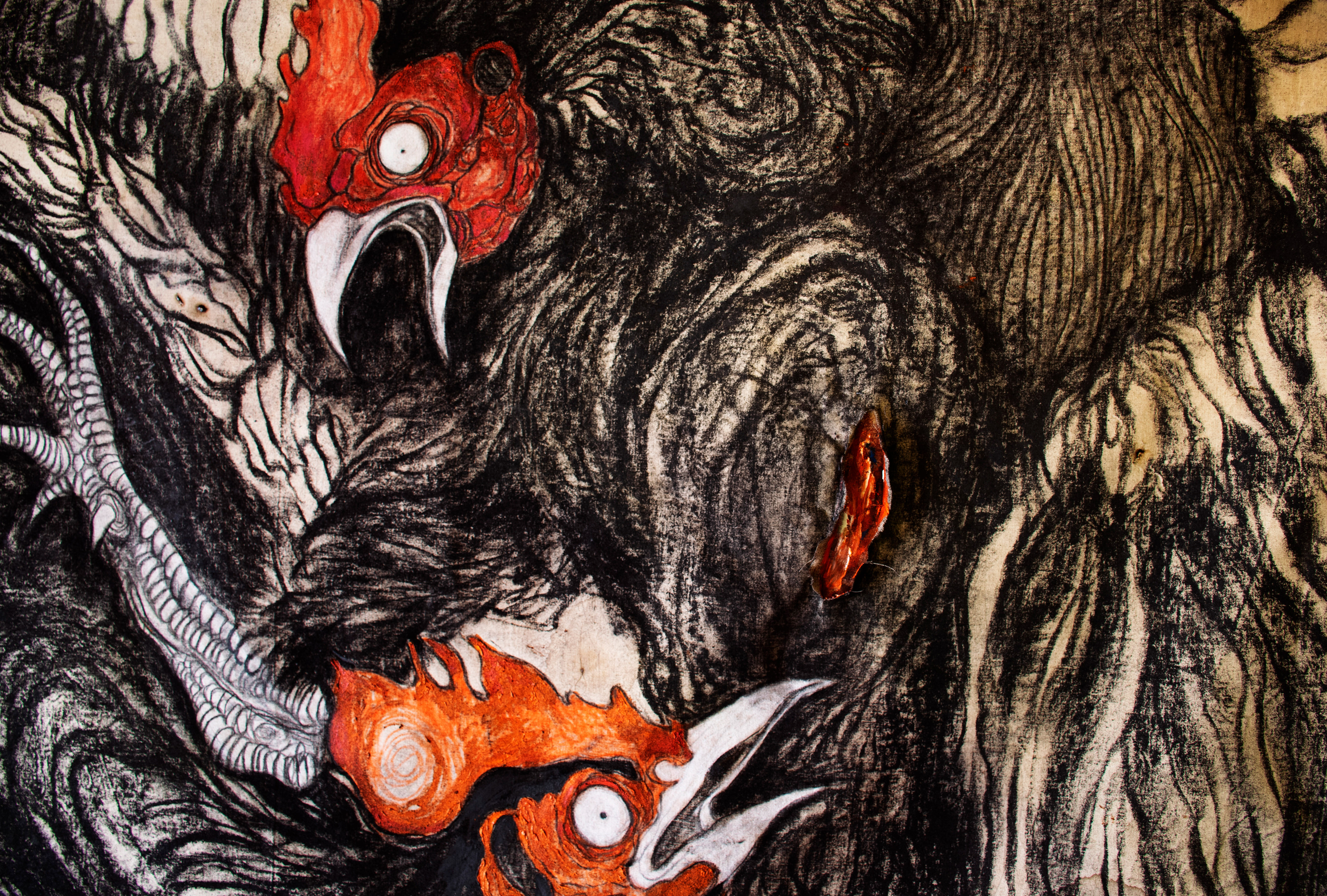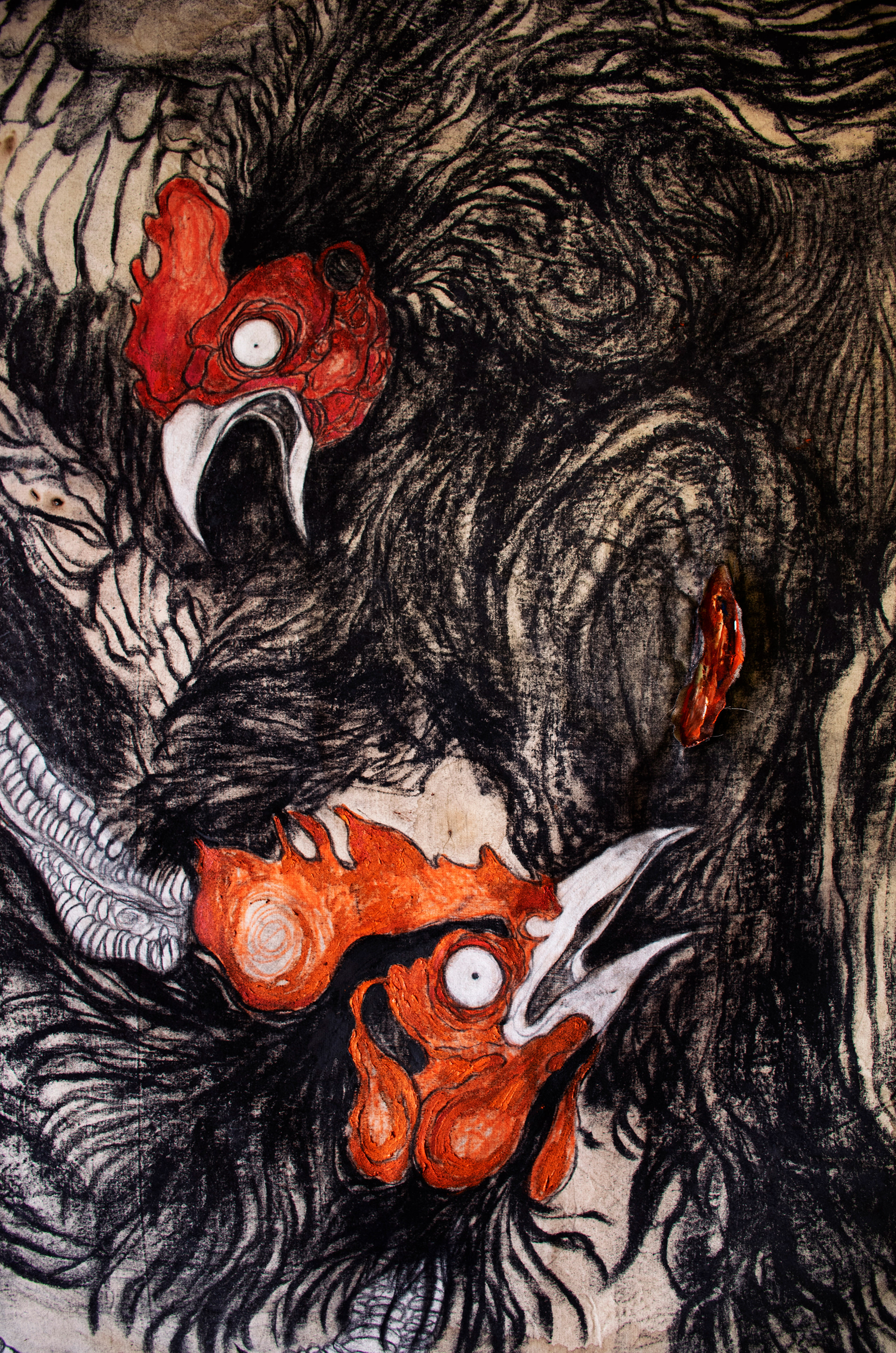 "Fight between roosters" • Charcoal and oil on paper • 3 m x 1.6 m • all credits belong to Anna Botticini 2019